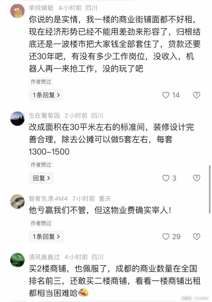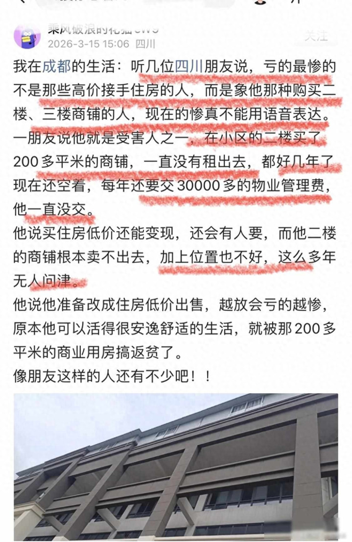 2023年他在成都一个新小区买了套二楼商铺,面积有二百多平米,花了一百多万,当时觉得单价只有一楼的一半,面积又够大,以后租出去就能稳定收租,结果从交房那天开始,这铺子就没开过门,三年过去一分钱租金也没进账。