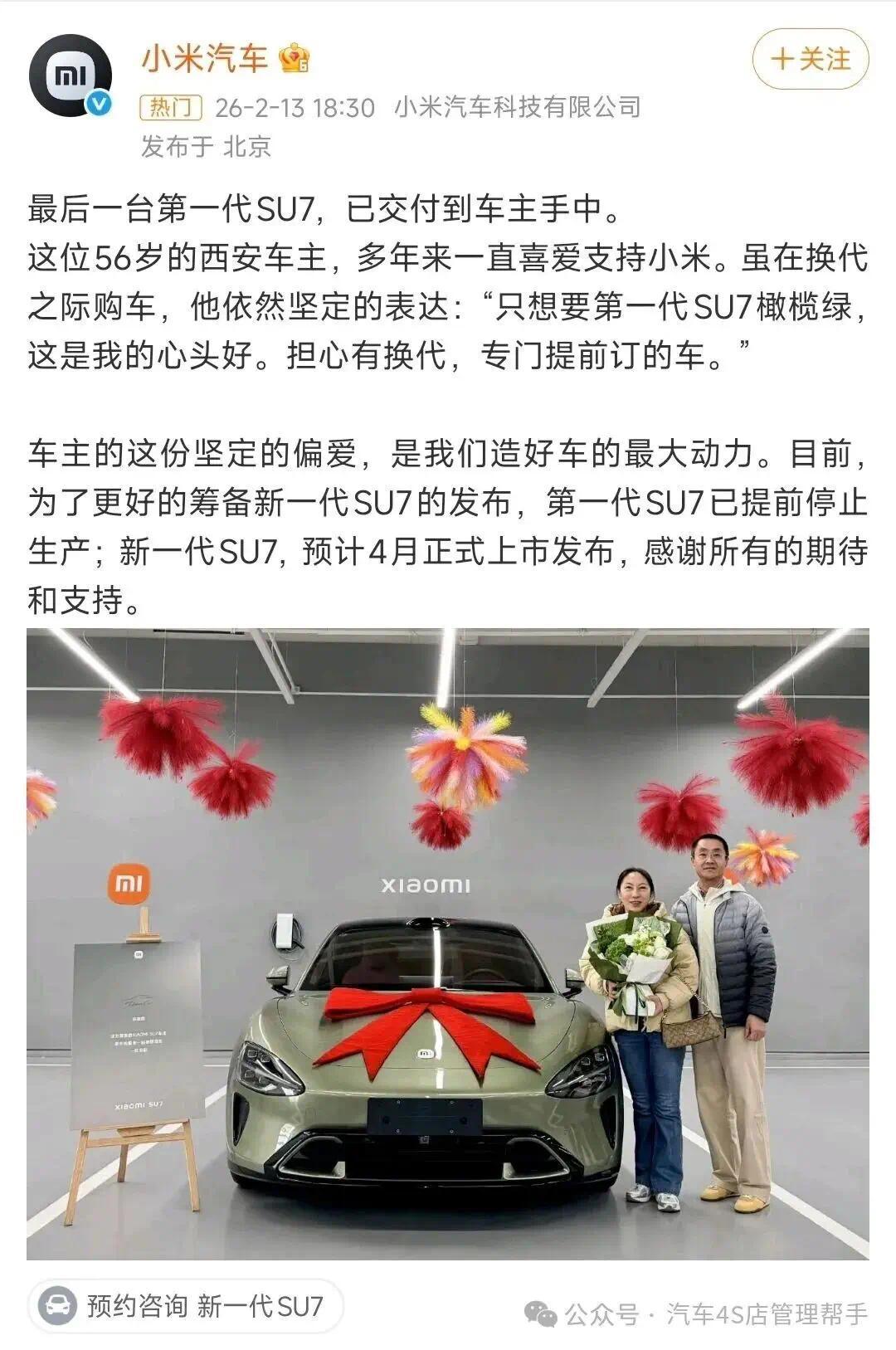 如今,老款SU7已正式完成历史使命,全国门店展车全部撤店、停产停售,以超38.1万辆的交付成绩,为初代篇章画上圆满句号。